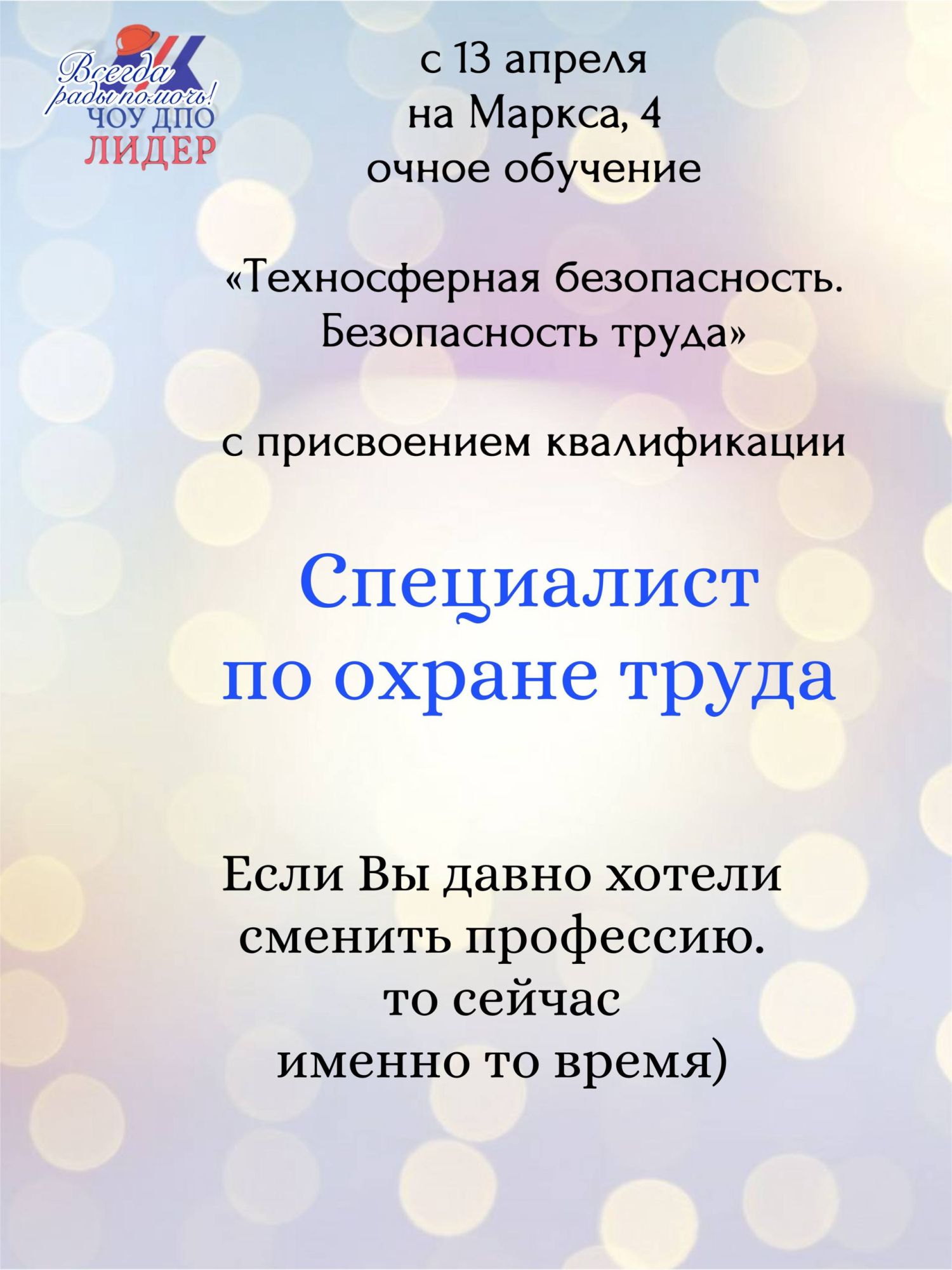 С 13.04.2026 на Маркса, 4 объявляется старт очного обучения "Техносферная безопасность. Безопасность труда" с присвоением квалификации "Специалист по охране труда"
